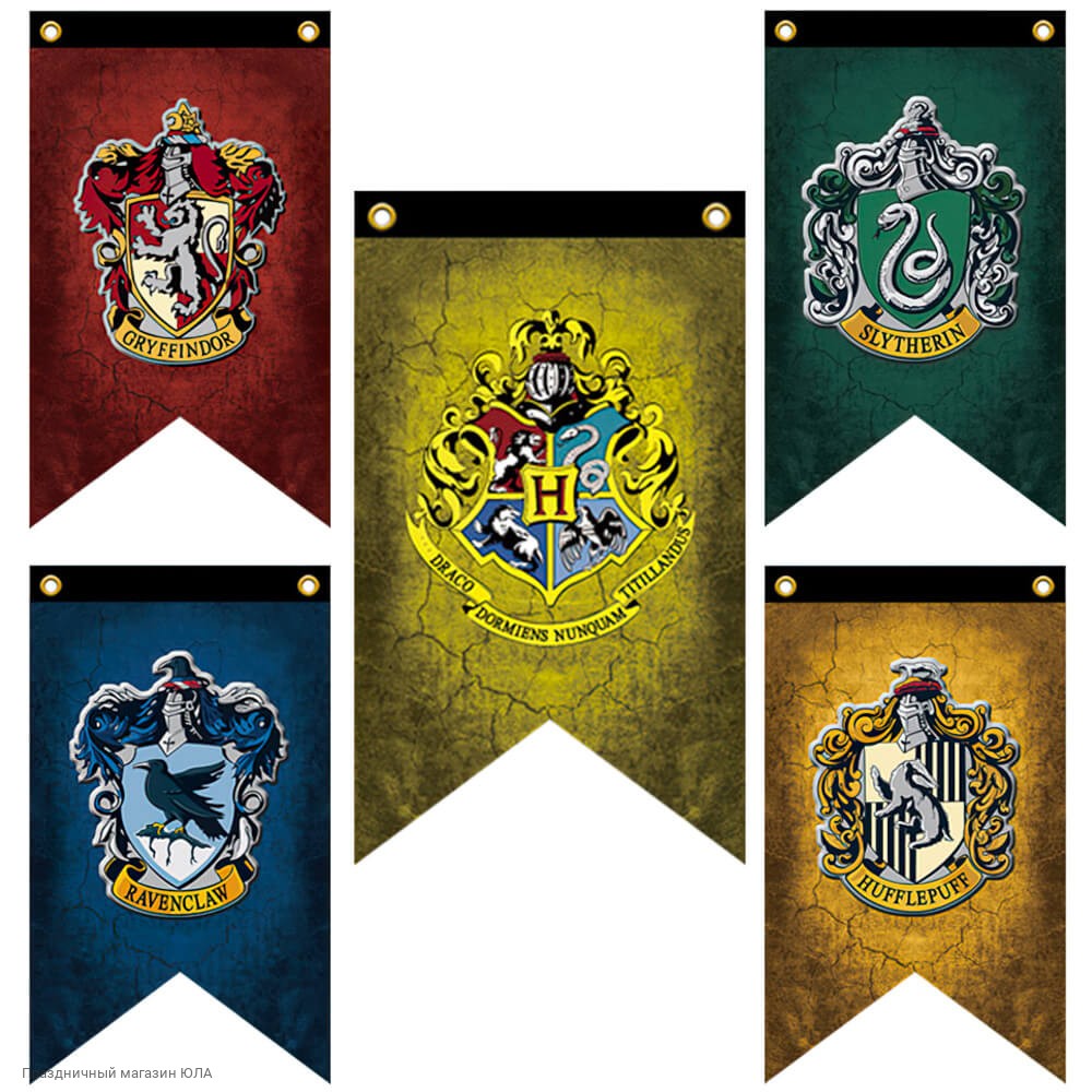 Комплект из 5 флагов с символикой школы магии Хогвартс и её факультетов прекрасно подойдут для оформпления праздника в стиле "Гарри Поттер".