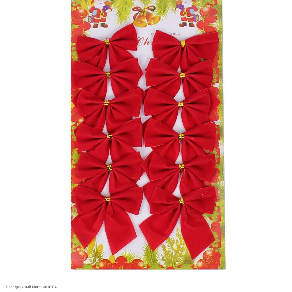 Набор из 12 красных бантиков станет прекрасным дополнением к новогоднему образу или декору.