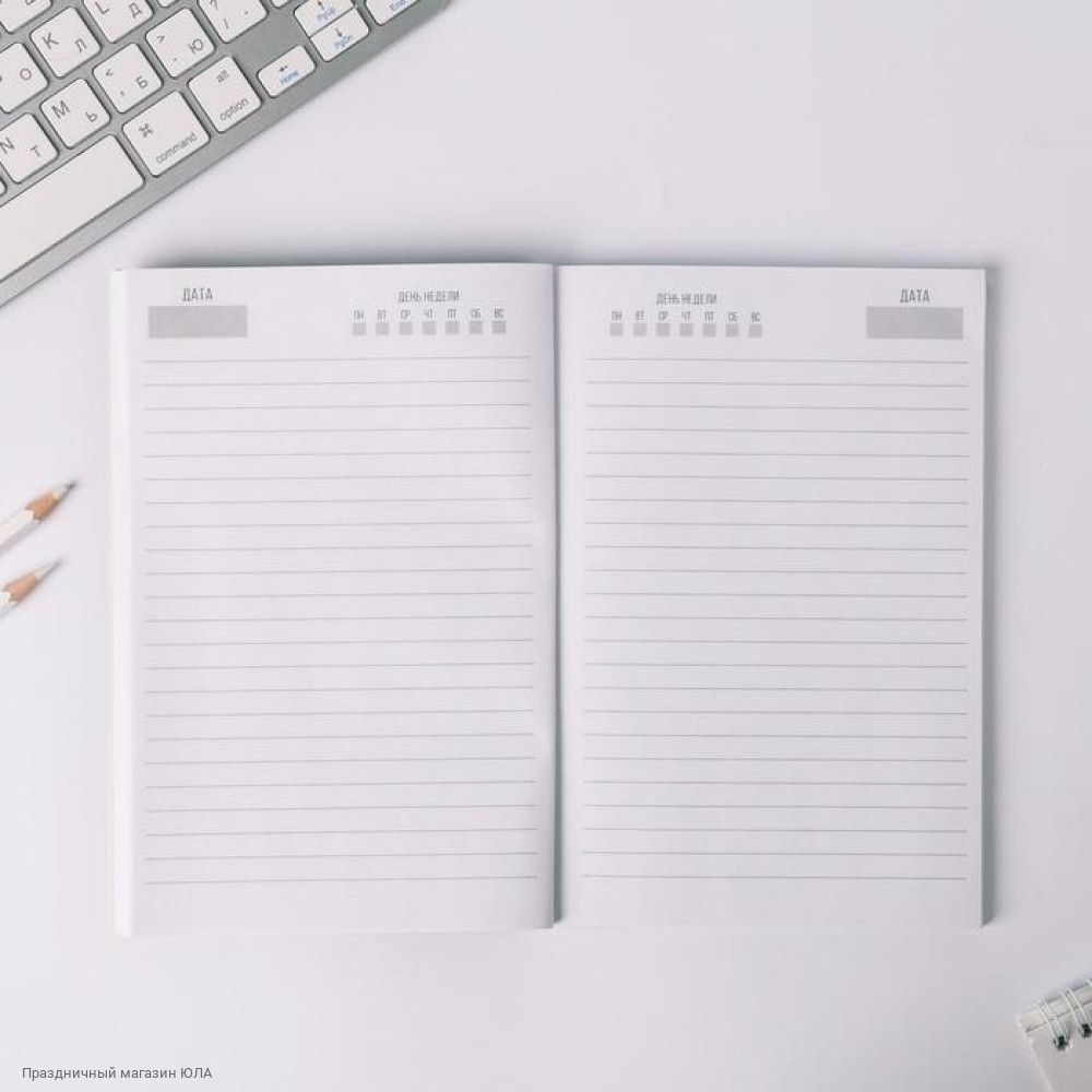 - Внутри 80 листов в формате А5 (14,8*21 см) с линовкой, полями для даты и дня недели.