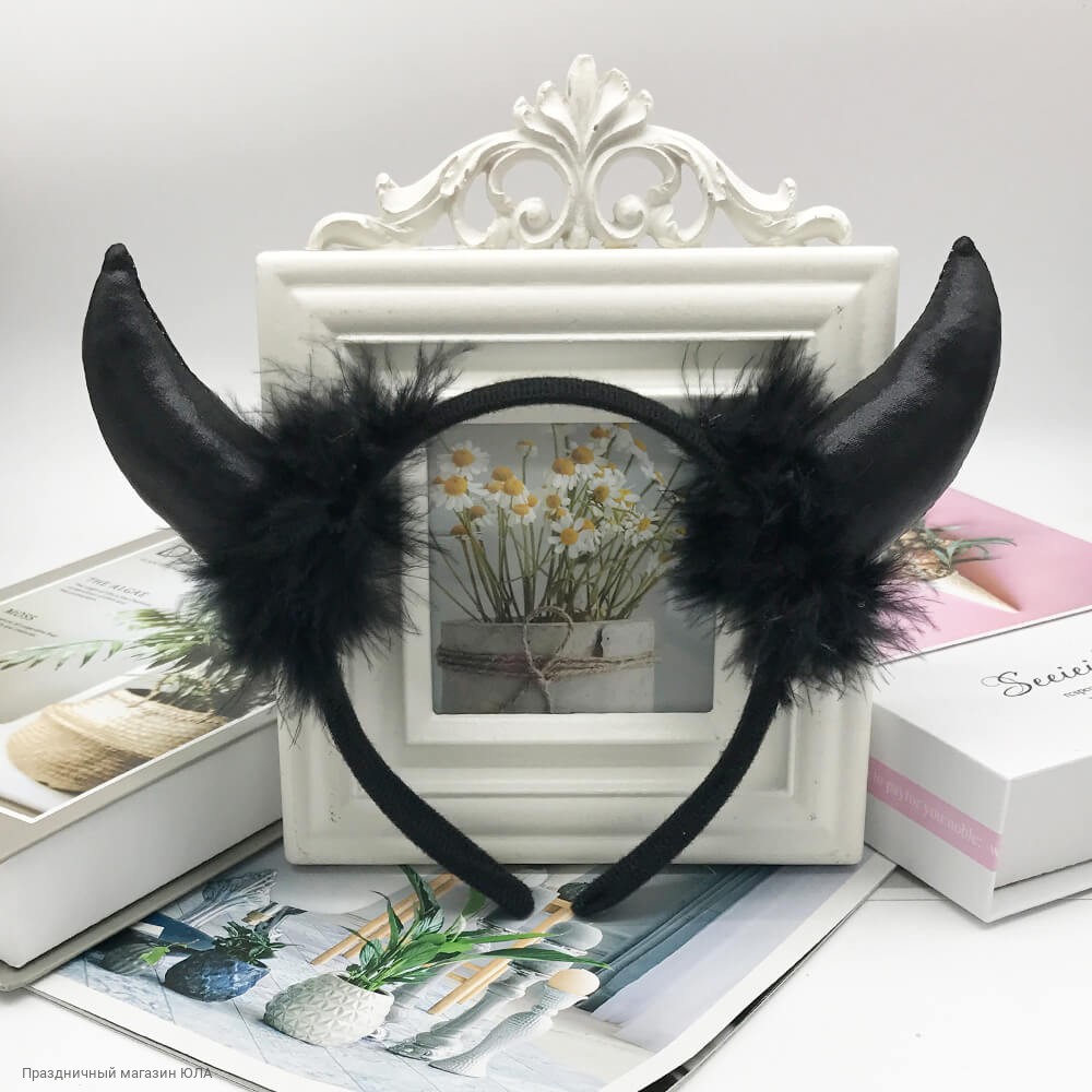 Рожки Чертёнка с пухом чёрные (металлик) 19*19см