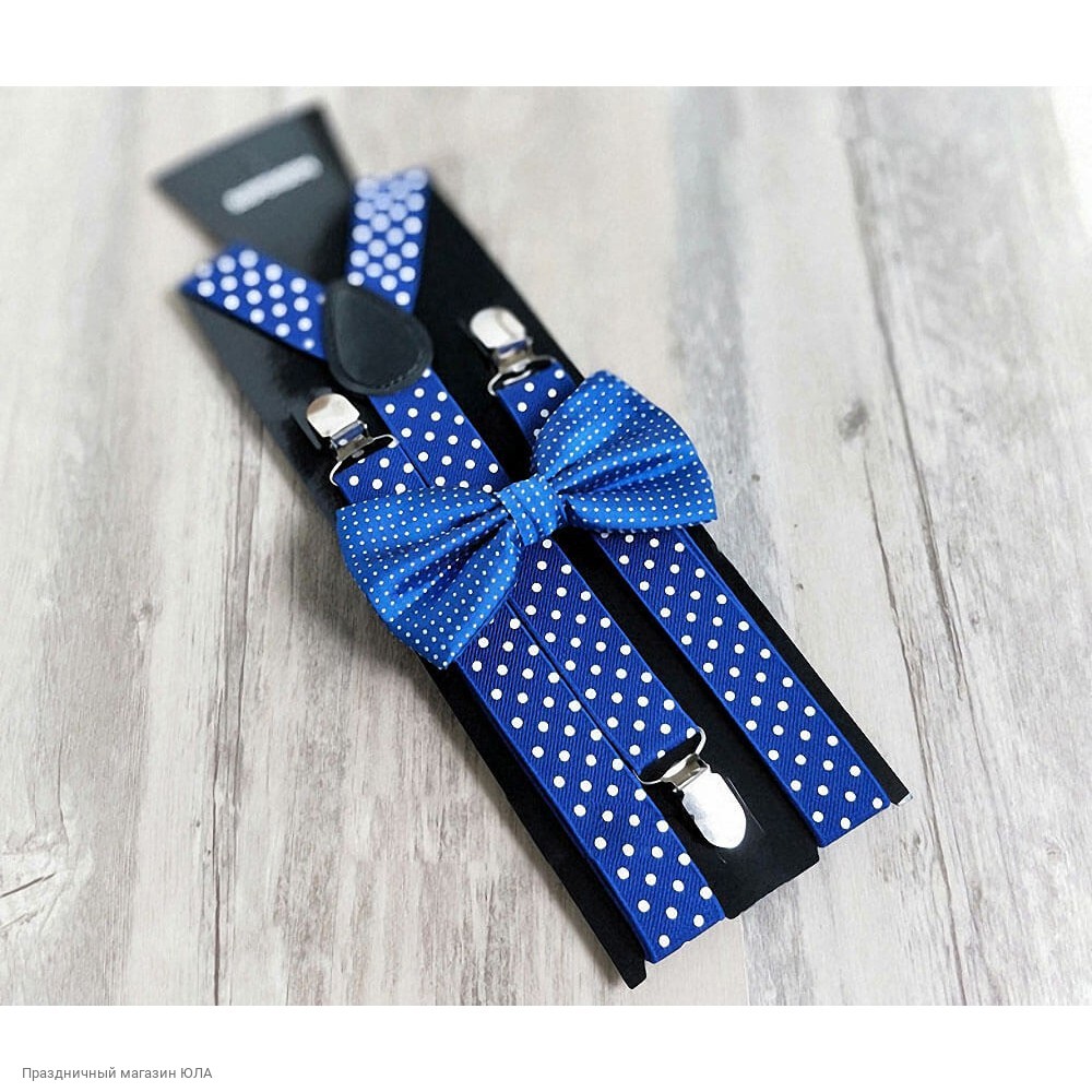 Набор подтяжки и галстук-бабочка, белый горох на синем