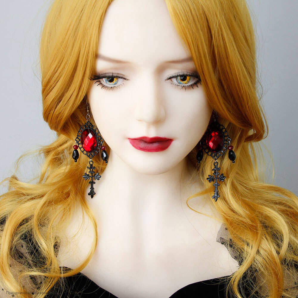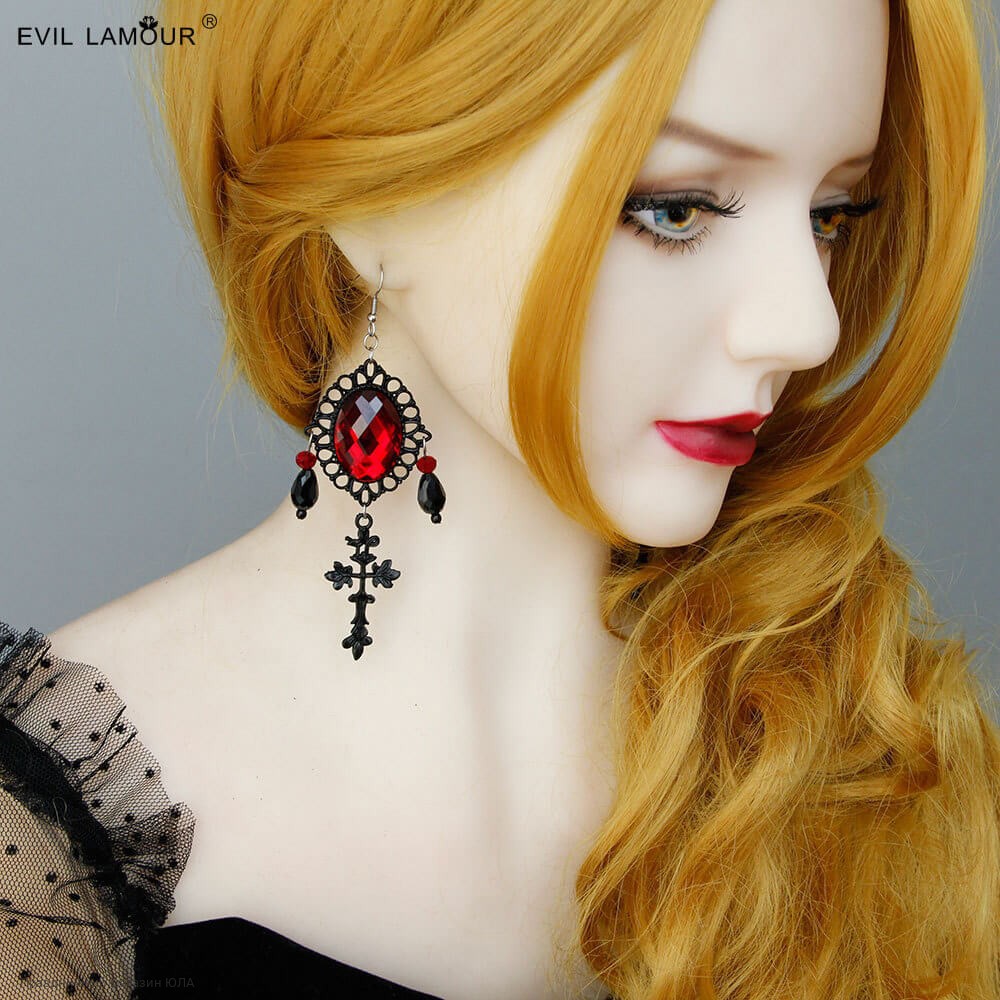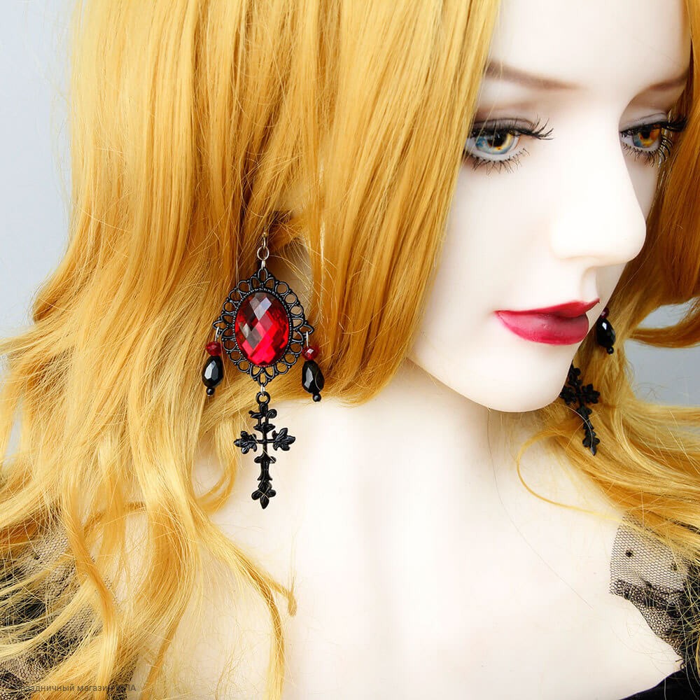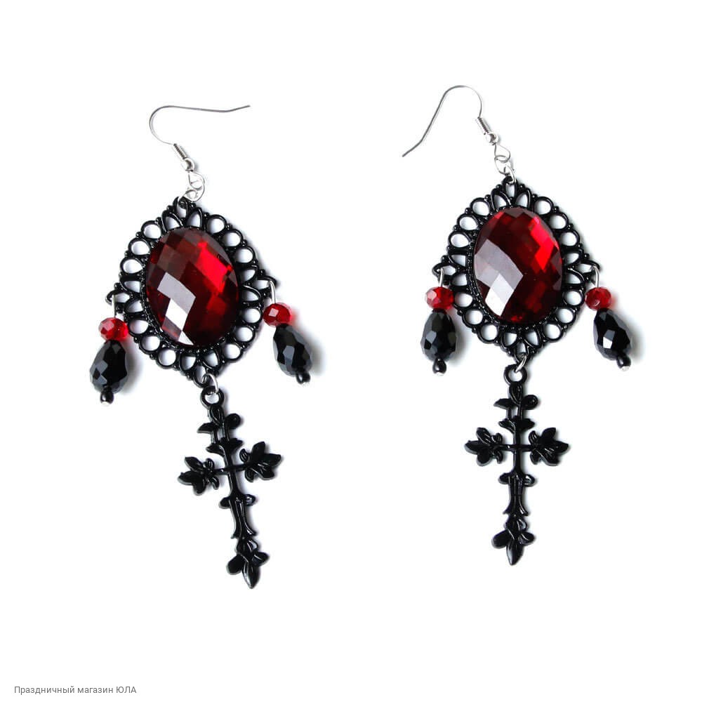 Серьги с красным камнем и крестом