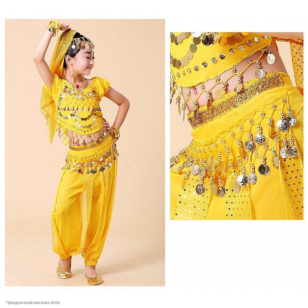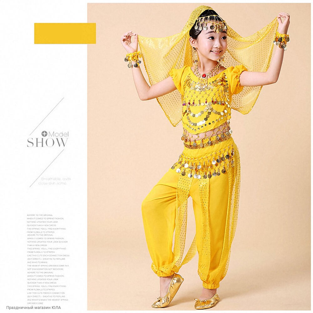 Состав: топ на завязках с короткими рукавами, шаровары, пояс-монисто, платок с украшением на голову, ожерелье.
