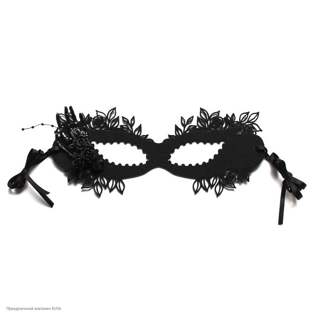 Маска выполнена из плотного черного фетра и украшена изысканным резным узором. По бокам расположены декоративные элементы: нежные розочки, изящная кисть с бусинами и тонкие кружевные вставки. Маска закрывает верхнюю часть лица, оставляя губы открытыми для улыбки.